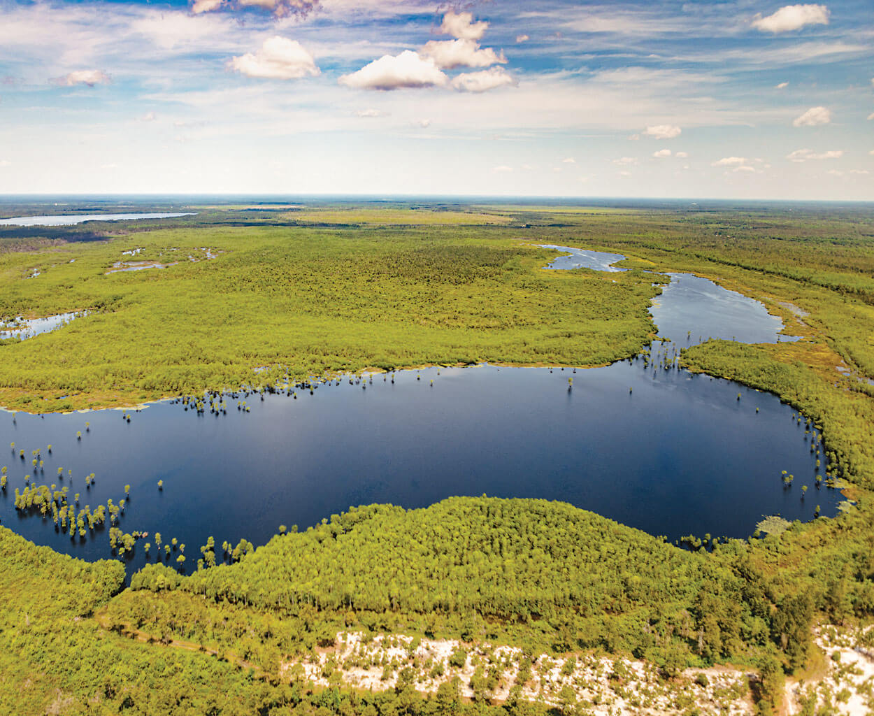 This lake is no ordinary lake. This lake — its perfectly rounded edges hugged by a rim of sand — is a Carolina bay, one of thousands in the southeastern corner of our state. Most bays are now boggy or dry, having been crowded with vegetation or drained for farmland. But a few are home to beloved bodies of water: Singletary, Jones, Waccamaw, White. People lived alongside the bays for millennia before the 1930s, when aerial photography brought their true nature into focus. From Delaware to Georgia, hundreds of thousands of depressions pock the landscape, each with the same elliptical shape. In the Carolinas, where the bays are most plentiful, they also share a northwest-to-southeast orientation.
