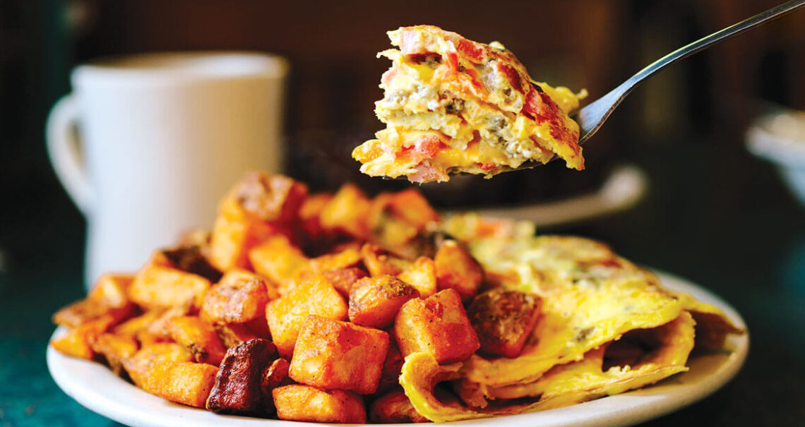 By 9 a.m. most weekends, a line of hungry customers snakes out the door. Fried bologna sandwiches and strawberry-dotted Belgian waffles the size of small birthday cakes fly across the counter, delivered by peppy young women in blue jeans and ponytails. Bob’s special house omelets, especially popular on cold mornings, are stuffed to overflowing with breakfast meats and veggies. Sometimes he goes a little crazy with portion size for a regular, or for anyone who looks like they need it. One early-morning regular recalls a breakfast sandwich Bob once made him, taller than a triple-decker and leaning like the Tower of Pisa.