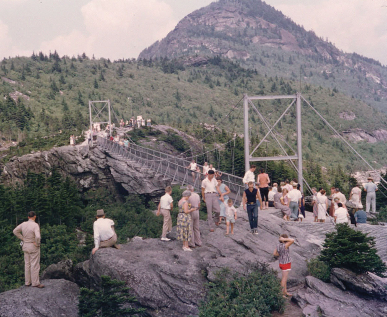 Familiar sights: The Mile-High Swinging Bridge at Grandfather Mountain became an instant tourist attraction when it opened in 1952. photograph by the hugh morton photographs and films #p0081
