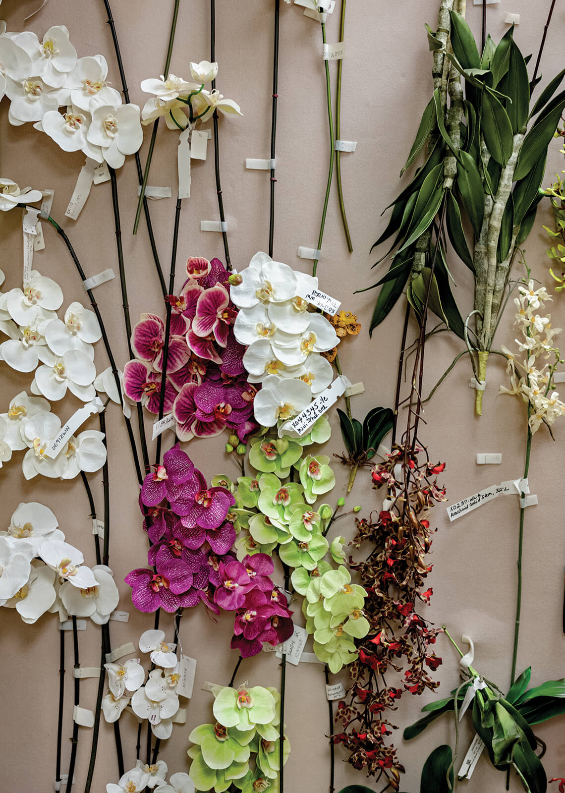 Those callers appreciated the beauty of Glenn’s creations and were able to get past the stereotypical image that people think of when they hear “artificial flowers”: oversize plastic dollar-store bins packed full of flat pastel roses — knockoffs that can add color, but not life. “Those give artificial flowers a bad name,” Glenn says. “Most of the flowers you see at the big-box stores are stamped out, die-cut, and stacked on a stem.”