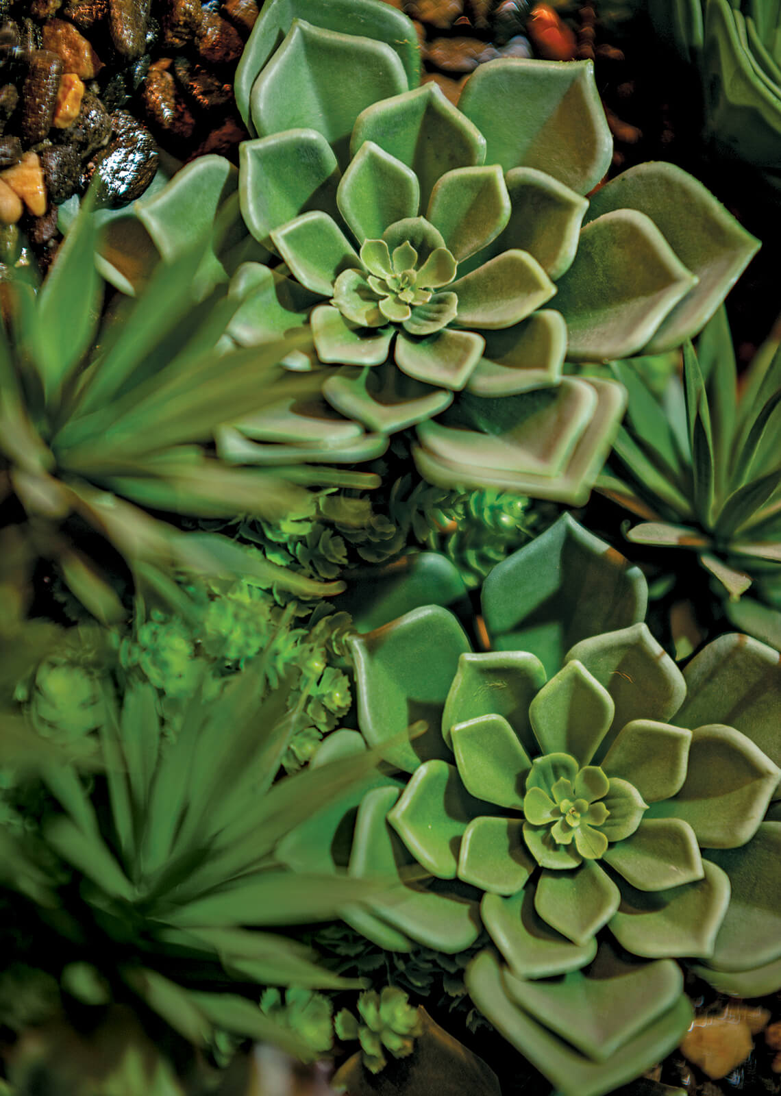 Ed Glenn (above) takes a hands-on approach to floral design — even when the materials are man-made. For his 24- and 36-inch magnolia wreaths, hundreds of leaves are meticulously attached to the frame, one by one. Succulents (below) are known for their durability, but the real ones don’t come close to the plants that Ed creates. photographs by Charles Harris