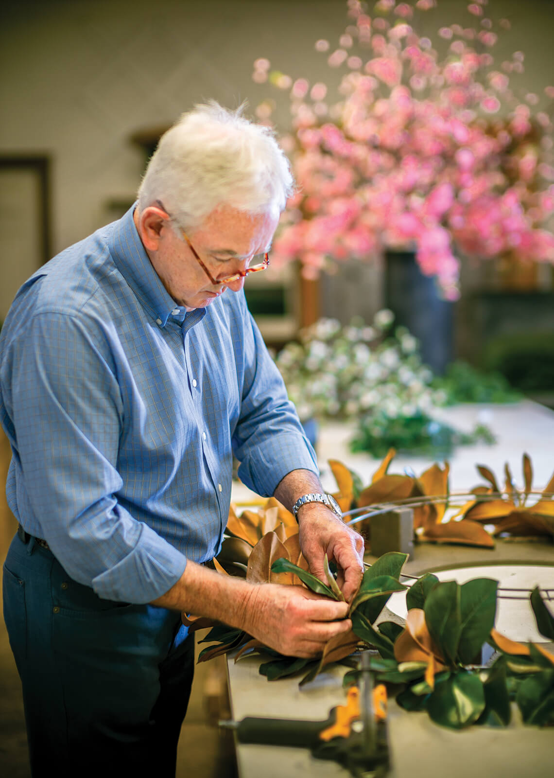 It worked, and New Growth Designs was born. Eventually, word spread of eastern North Carolina’s artificial flower prodigy, and Glenn’s phone rang with designers from high-end brands like Saks Fifth Avenue, Nieman Marcus, and John Hardy calling after his services. “They’d usually been encouraged to call by a colleague who’d seen our work somewhere else,” he says, laughing.