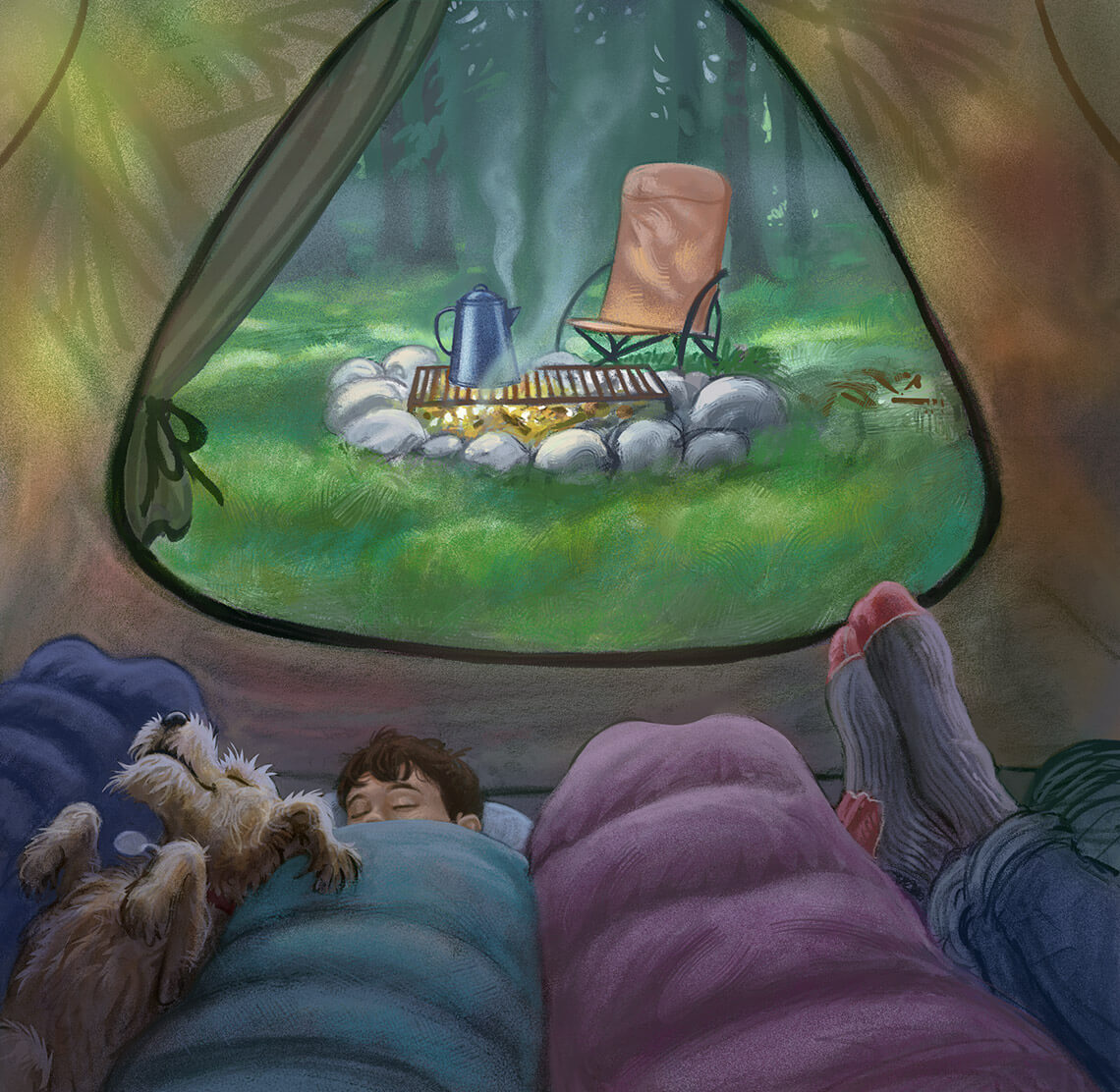 The fire is crackling; the coffee is hot. I hear a rustle of sleeping bags. Someone’s emerging. The day is beginning. I glance at the vast spread of nylon under the trees and think: Anybody that needs a tent that big ought to be ashamed of himself.