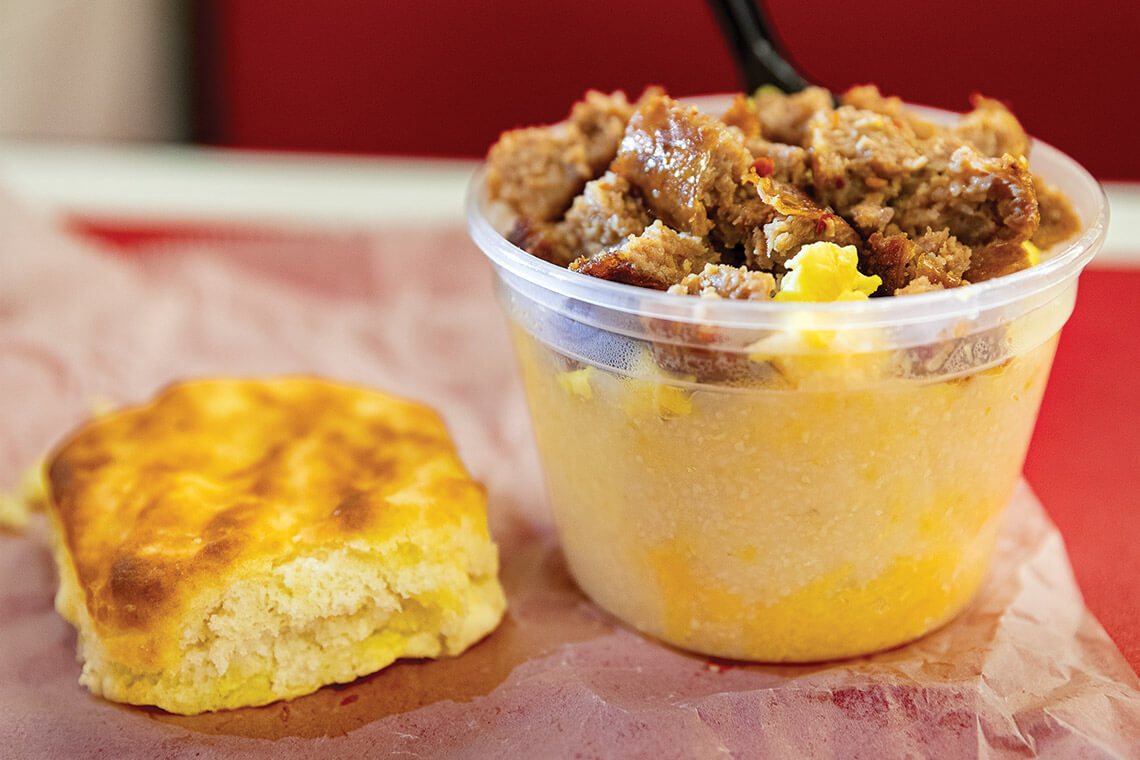 The Murrill Bowl — a pint container loaded with grits, cheese, scrambled egg, and your choice of sausage or bacon — with a biscuit is a staple breakfast at The Pig. photograph by Charles Harris