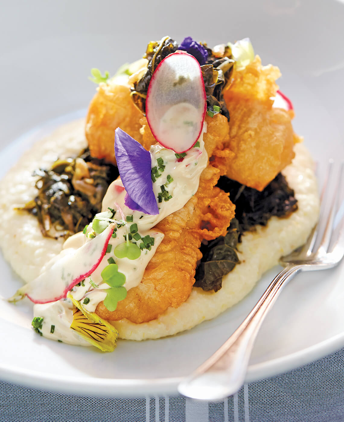 One of The Prescott’s popular dishes is triggerfish with pecan grits and locally grown collards from 5 Woods Life, an organic farm just four miles east of the restaurant. photograph by Stacy Van Berkel