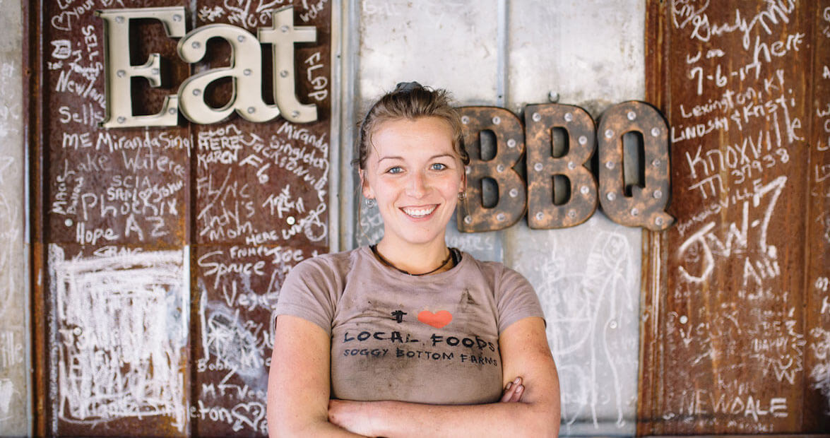 Her market sells Soggy Bottom Farms meat and other locally raised and gathered products. The ever-changing selection is a good picture of what’s in season in the mountains. You might find string beans grown nearby, fresh eggs, and a cooler stocked with buttermilk, along with bunches of herbs, even herbal remedies. A native Appalachian with an accent as thick as Dolly Parton’s, Lacey knows this land and what can spring from it — if it’s tended right and cared for. The fresh-faced 30-year-old, with her big pile of haphazardly pinned-up hair, smudged T-shirt, well-worn jeans, and muddy work boots, knows hard work.