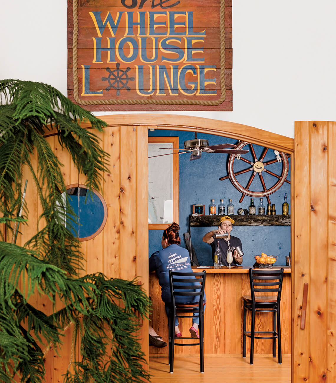 Below a salvaged ship’s wheel at Outer Banks Distilling, Matt Joyner mixes a RumTing in the Water (rum, grapefruit soda, and a simple syrup) for Pamela Gutlon. photograph by Baxter Miller