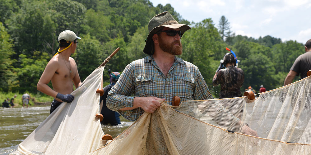 Over the years, Ed has learned that the survey works best when volunteers are separated into four groups: Lifters pull rocks from the river-bed, divers snorkel under them to look around, and seine net holders attempt to catch whatever escapes. Animal processors inspect any salamanders found and record data in a support boat.