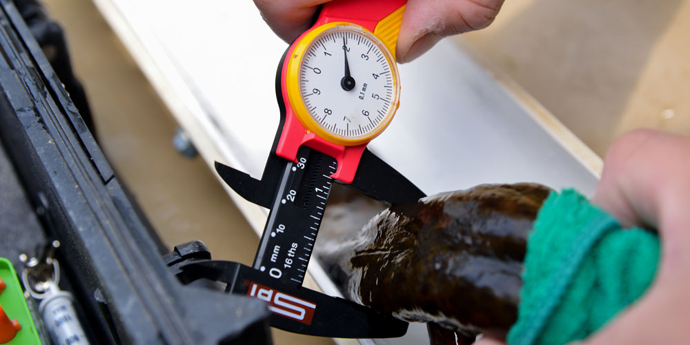 Volunteers measure each hellbender they find and researchers use this information to judge the health of the population. Because hellbenders breathe through highly permeable skin, a healthy specimen is a good indication of a clean waterway. photograph by Brian Gomsak