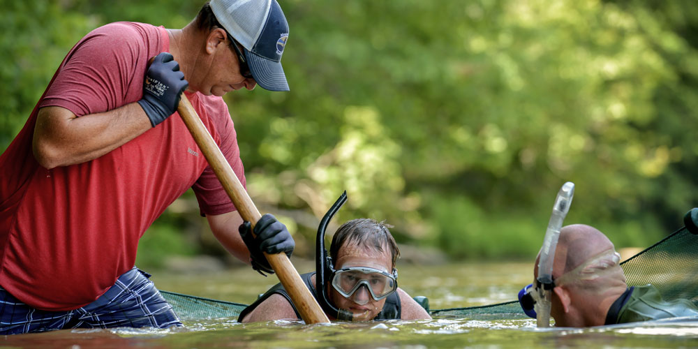 Ed Corey (middle) wears snorkel gear for the hellbender hunt. Capturing a slippery critter takes a quick hand. photograph by Brian Gomsak