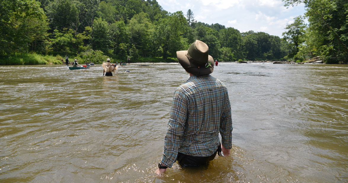Over the years, Ed has learned that the survey works best when volunteers are separated into four groups: Lifters pull rocks from the river-bed, divers snorkel under them to look around, and seine net holders attempt to catch whatever escapes. Animal processors inspect any salamanders found and record data in a support boat.