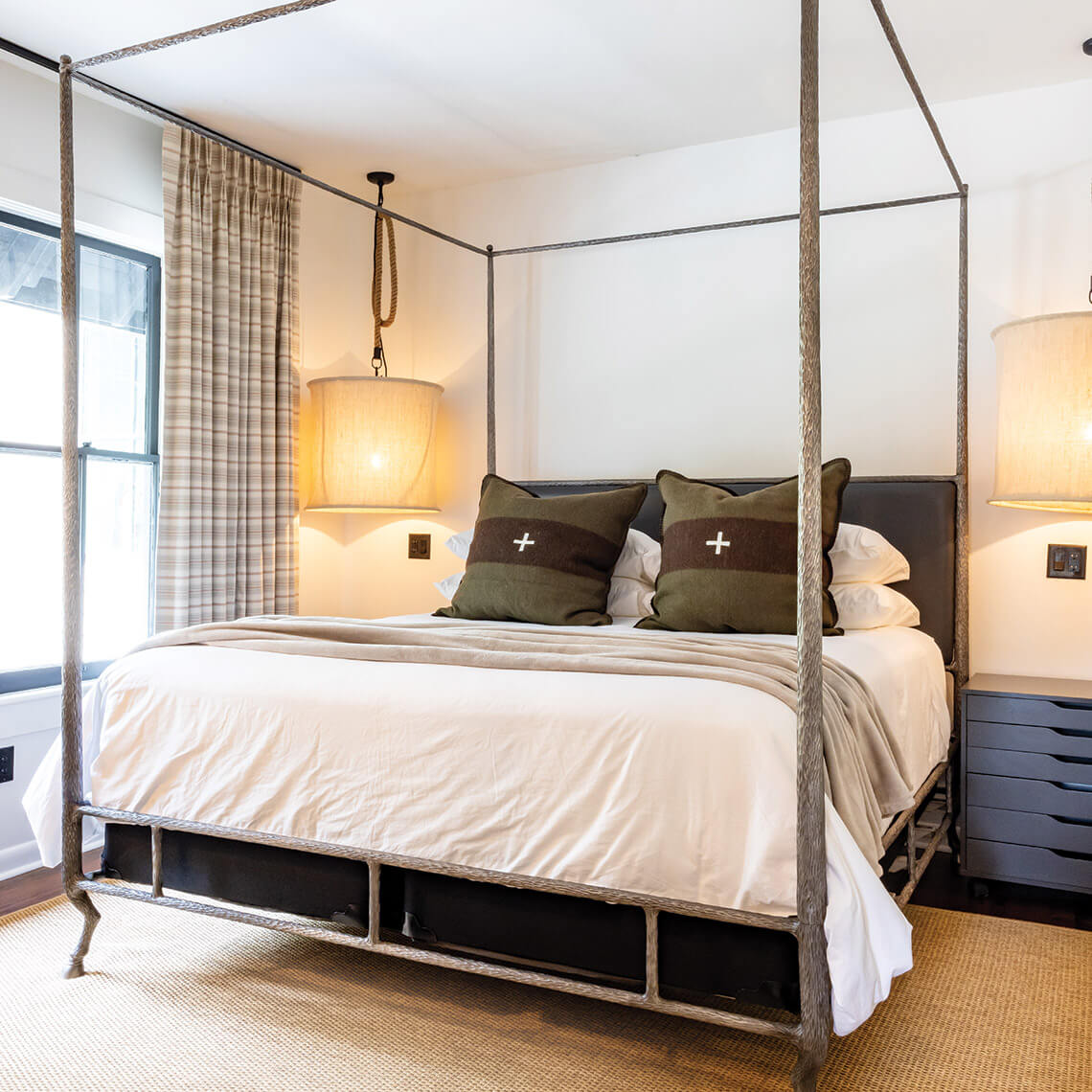 Kirby and Burriss consolidated the 18 guest rooms into a dozen, allowing for larger accommodations, each with its own bathroom, kitchenette, and California king-size bed outfitted with luxury linens. Beyond that, each room is “drastically different,” Kirby says, with custom fabrics and window treatments.