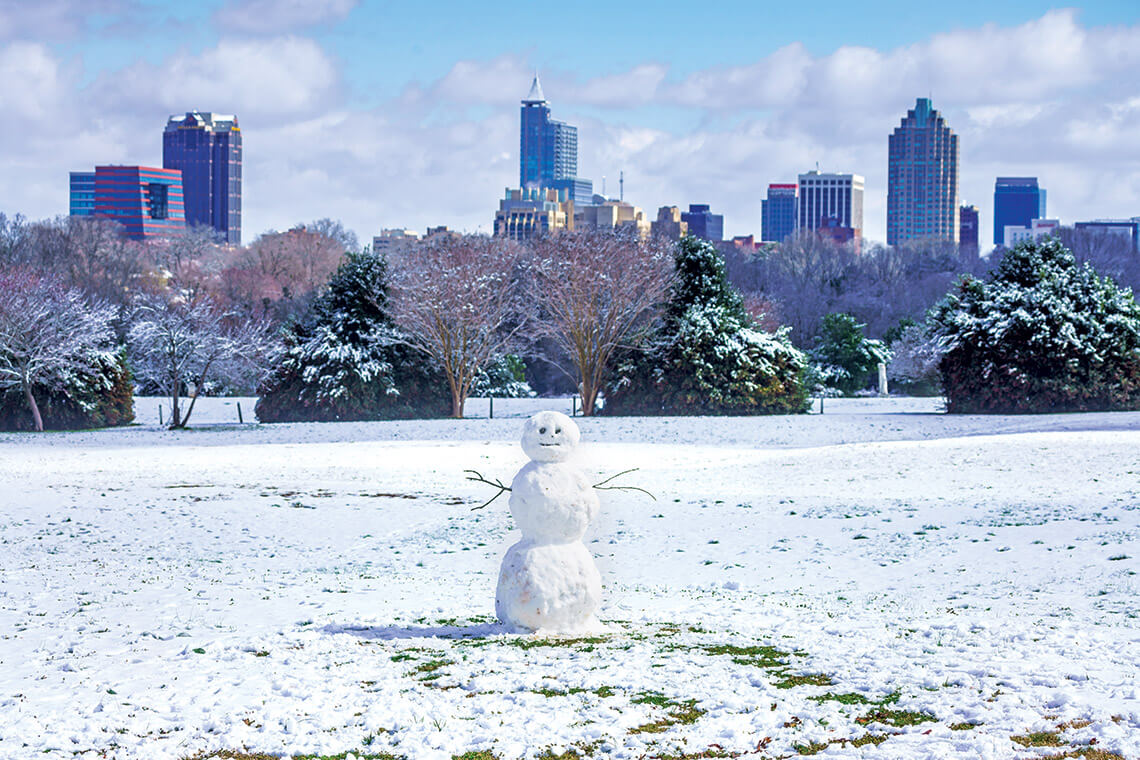 When it snows in Raleigh, as it did in February 2020, kids off from school flock to Dorothea Dix Park, where they sled down a popular hillside and find flatter ground to build a snowman. photograph by MATT ROBINSON/RALEIGHSKYLINE.COM