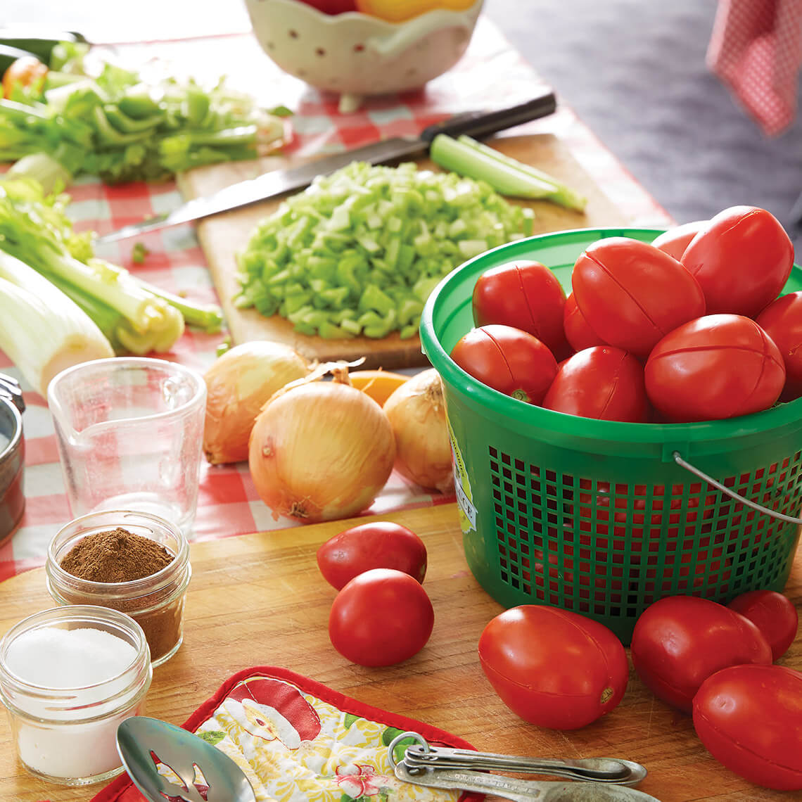 ¼ bushel Roma tomatoes (about 13 pounds) 1 small bell pepper, chopped 1 to 2 hot peppers, chopped 1 bunch celery, chopped 1¼ pounds yellow onion, chopped 2 cups vinegar 1¼ pounds sugar ½ cup salt Allspice to taste (about ½ tablespoon)