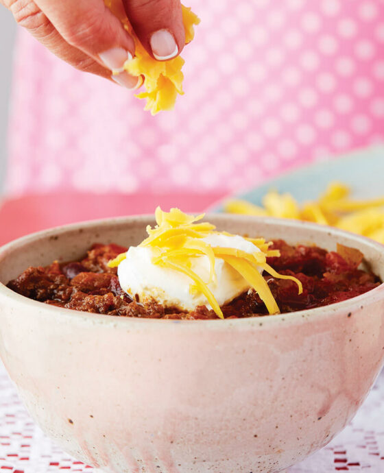 After all the vegetables are chopped and the tomatoes are peeled for the chili sauce, Allen squeezes the tomatoes by hand into a ceramic churn that belonged to Grandma Joyaux. She adds the vegetables and lets the concoction sit for 24 hours before cooking it down for up to 12 hours in the Nesco roaster. She then cans the sauce and stores it. She serves it in a bowl with cheese and sour cream — sometimes mixing in pinto or kidney beans — or on top of elbow macaroni with ground Angus beef. Her family eats the spicy, sweet sauce at family gatherings in the fall, with Allen surrounded by her children, their spouses, and her grandchildren. Her kids often tell her, “If you’re making Gram’s chili sauce, I’ll be there.”