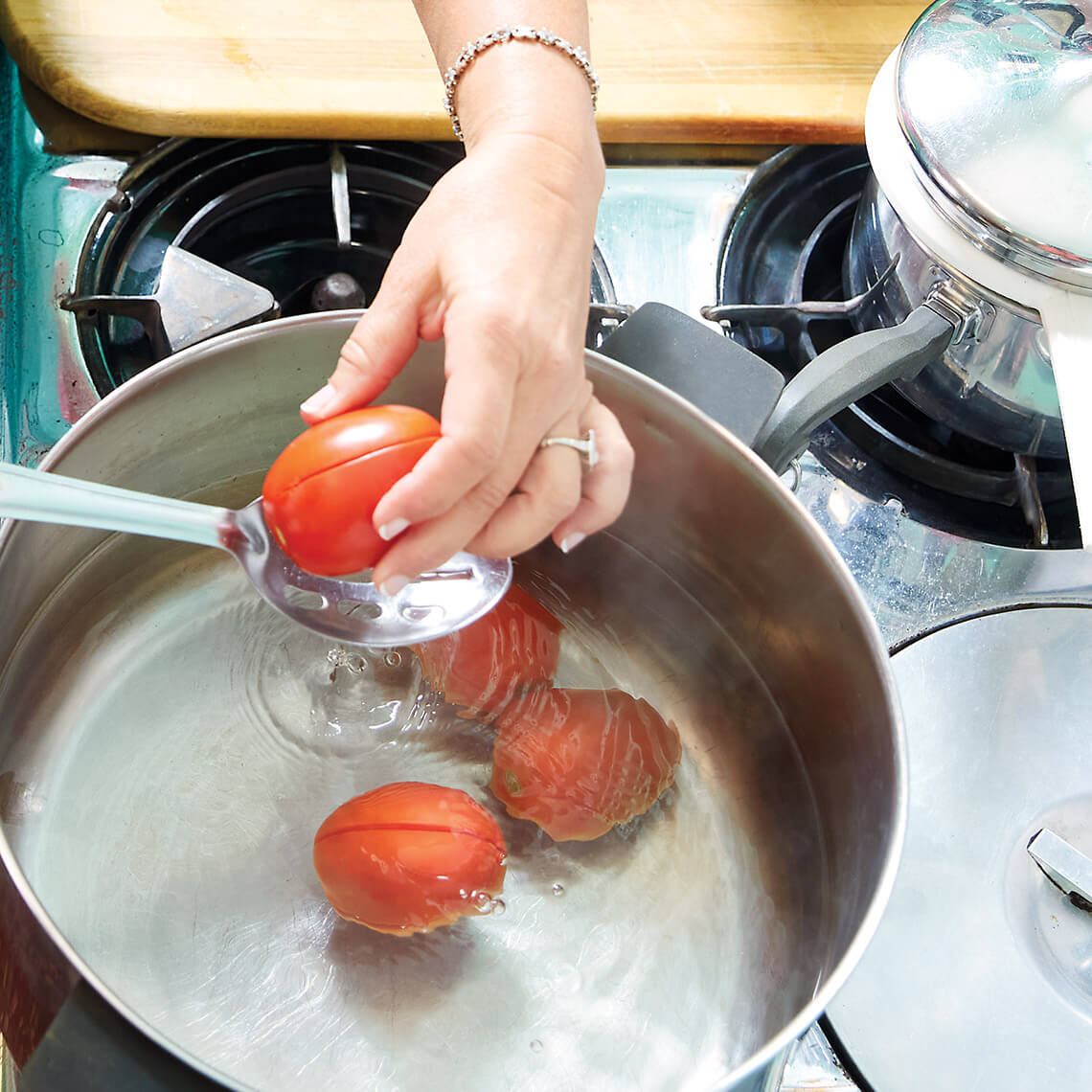 Together, they score and blanch tomatoes … <br><span class="photographer">photograph by Stacey Van Berkel</span>