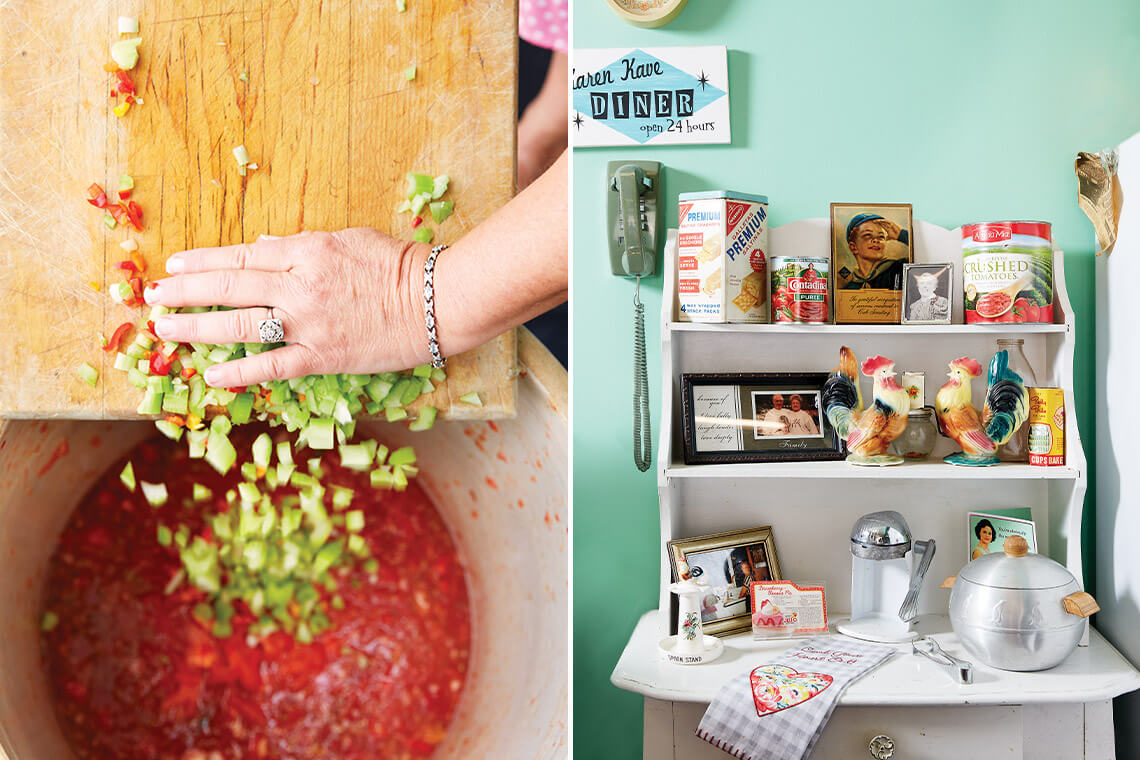 Not far from where Allen adds peppers and celery to her sauce, shelves from her grandparents’ house display the ceramic roosters that once stood by their kitchen sink, a saltine cracker can from her parents’ pantry, and her grandfather’s ice bucket. photograph by Stacey Van Berkel