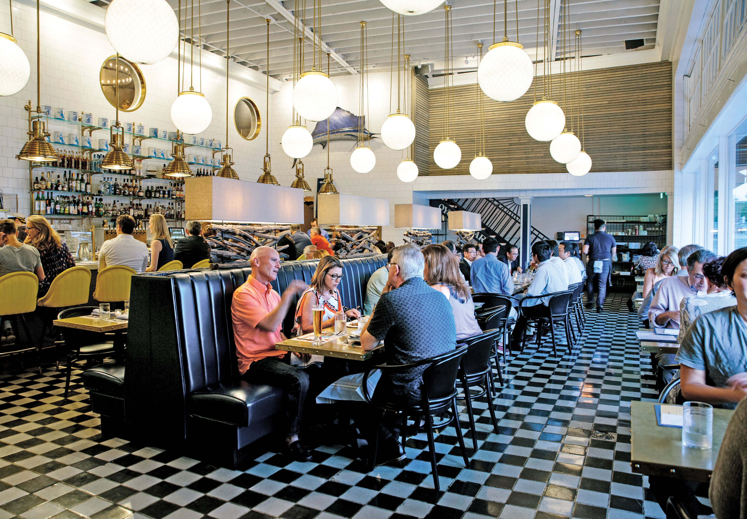 Diners at Saint James in Durham will notice that only a few details — the tile floor and the stairway — remain from the building’s days as Fishmonger’s. photograph by Anagram Photo