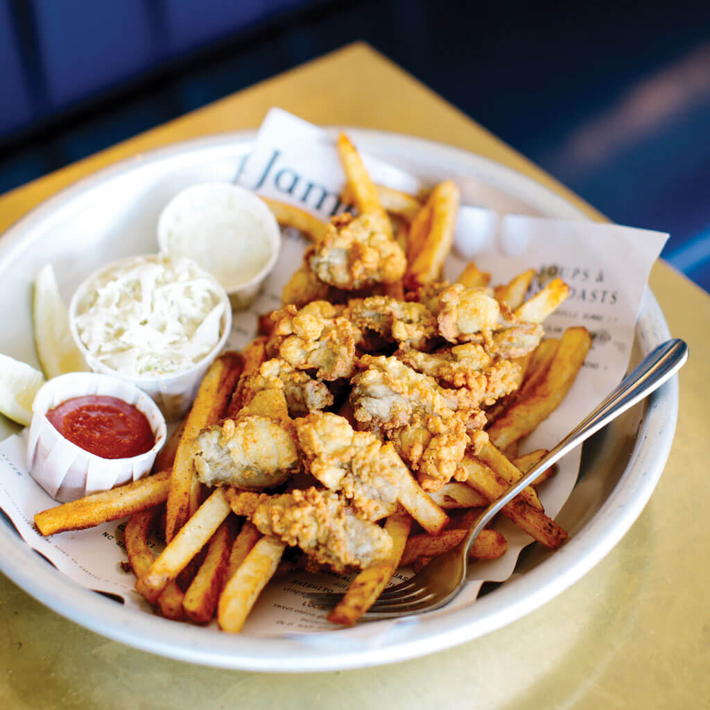 Calabash-style platters of fried oysters, shrimp, and fish bring coastal nostalgia to downtown Durham. photograph by Anagram Photo