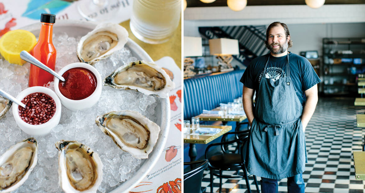 The buttermilk sky is just starting to roll in, and Chef Matt Kelly is on the phone. Again. Pacing the bar at Saint James Seafood, his newest restaurant, he checks in with his fishermen and his oyster growers: They’re all expecting the worst and have locked down their boats. “What more can they do?” Kelly asks with a helpless wag of his head. Here in Durham, Hurricane Florence has triggered a full-blown bread-and-batteries panic, but Kelly’s worry isn’t theoretical. It’s real, immediate. Closer to the heart. For him, the coastal community might as well be right down the street. “We had a clam guy who wanted to try to make it in today,” he says, amazed. “We told him not to; it was going to be 10 hours of traffic.”