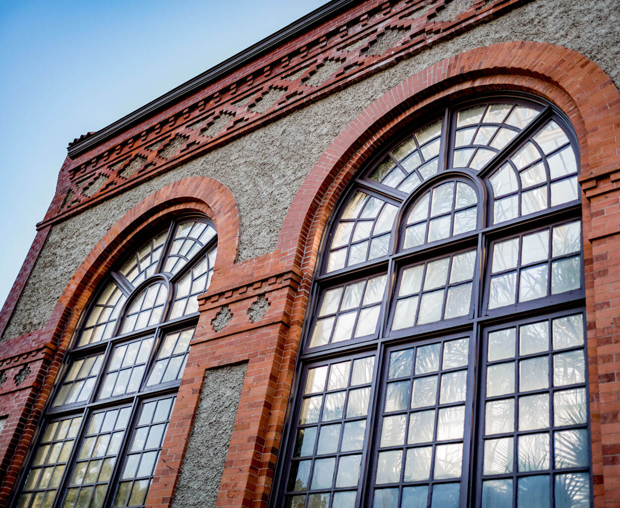 The five arched windows in the front of the conservatory offer a glimpse into the central Palm Room, a lush and steamy landscape of ferns and fronds of all shapes and sizes. photograph by Charles Harris