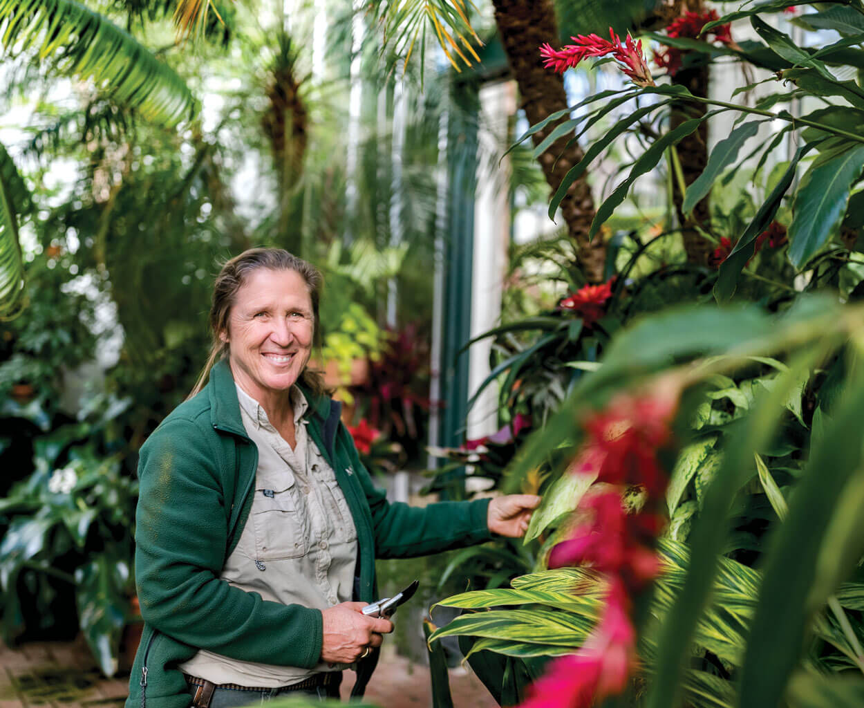 Beneath the 40-foot ceiling in the Palm Room, conservatory horticulturalist Kathryn Marsh is surrounded by her favorite family of plants: gingers. photograph by Charles Harris