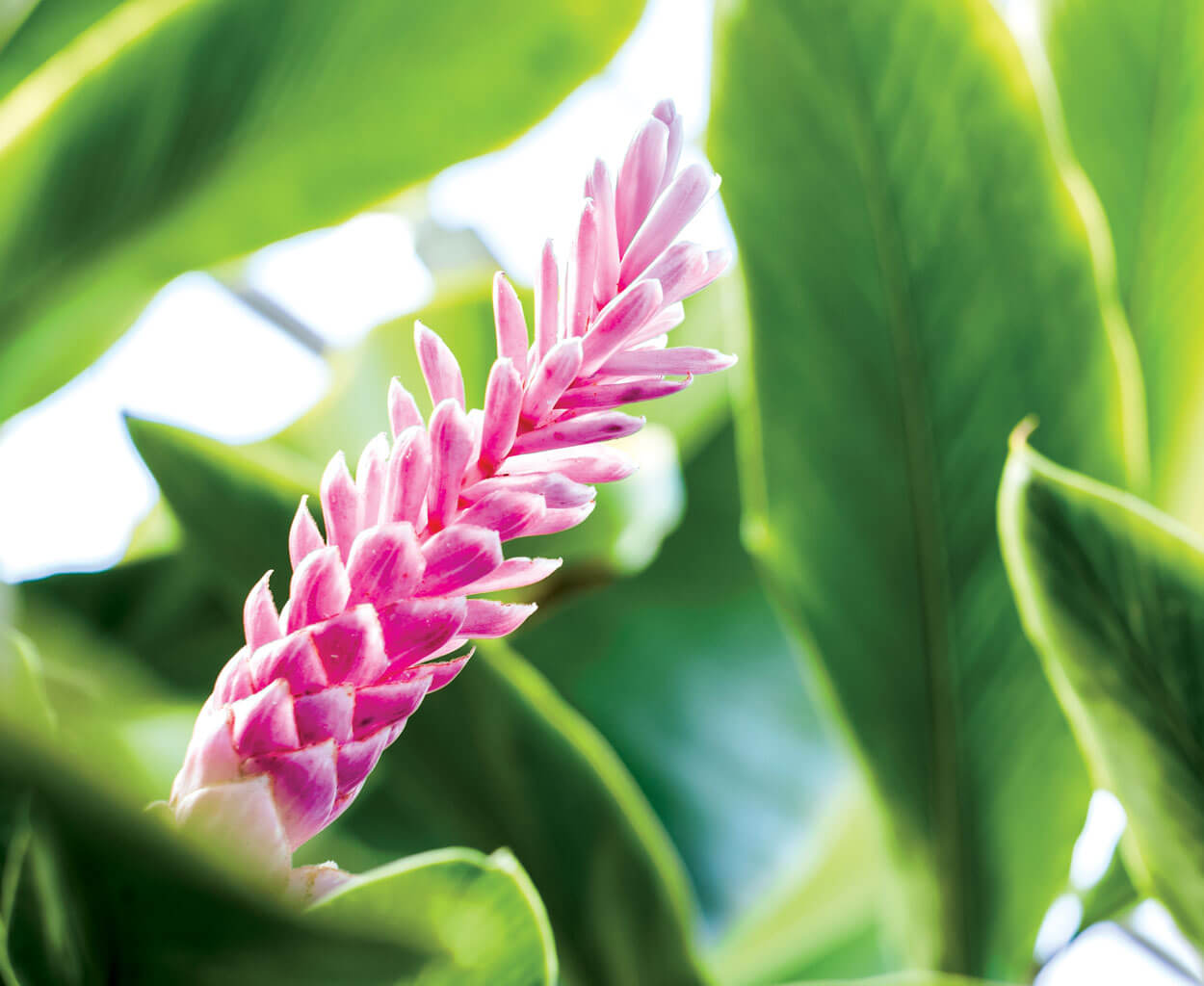 In the Palm House and elsewhere, the torch-shaped pink flower of the ginger plant adds a flash of color to the surrounding layers of green. photograph by Charles Harris