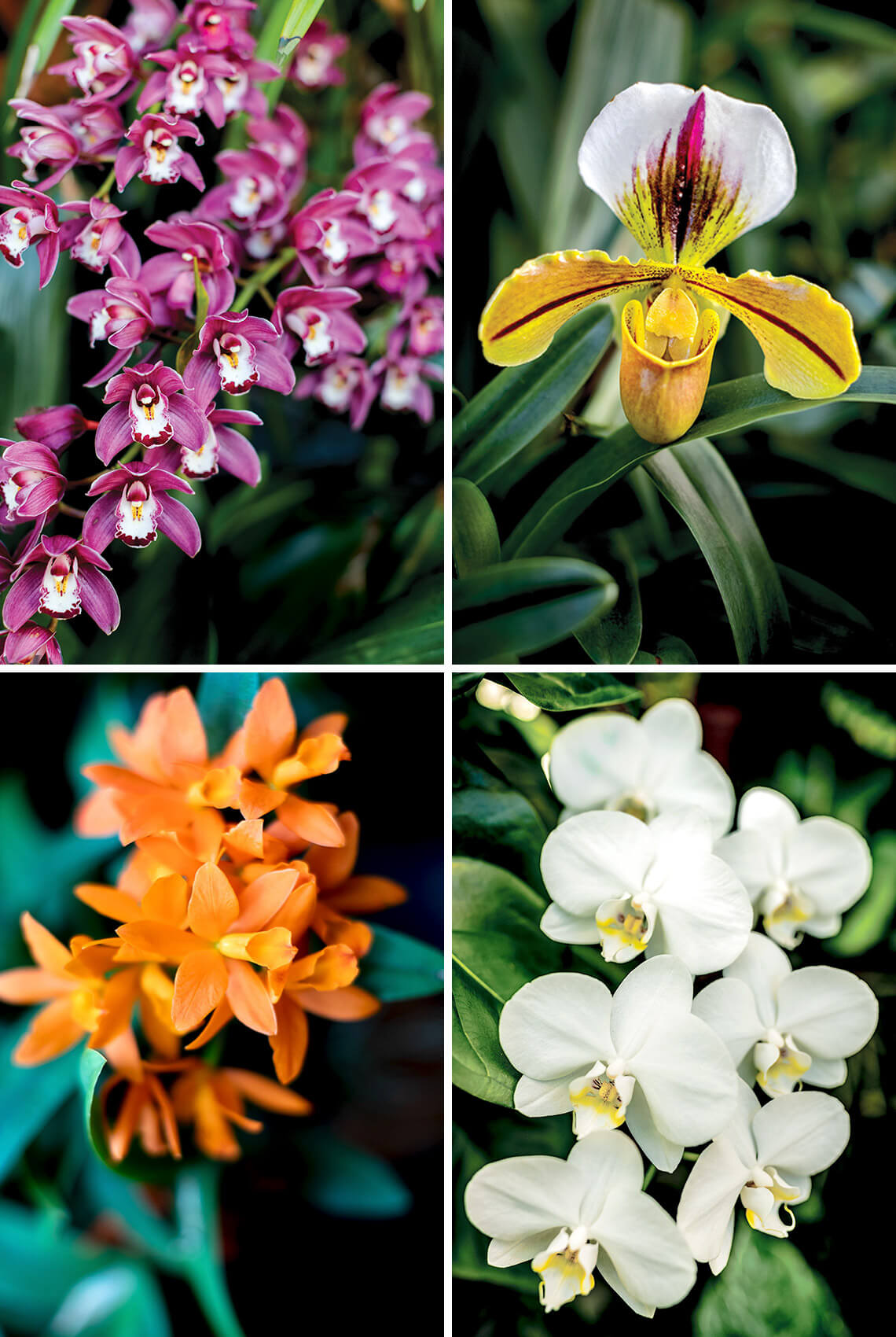 Clockwise from top left: A hybrid Cymbidium; a yellow Paphiopedilum hybrid, or slipper orchid; a white Phalaenopsis hybrid; and an orange Cattleya hybrid. photographs by Charles Harris