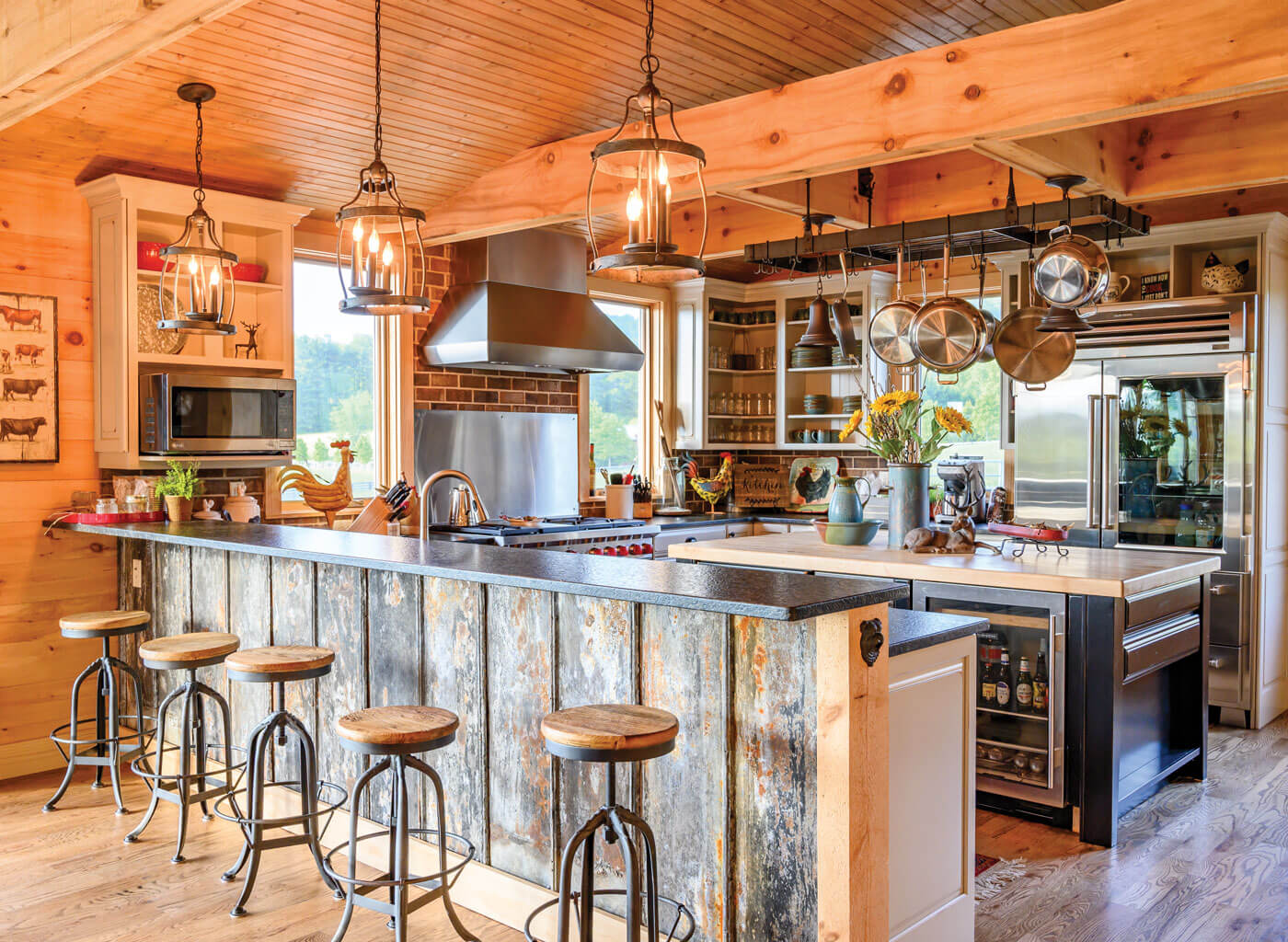 The rusted tin paneling around the kitchen bar is scrap metal from the barn’s original roof. photograph by Emily Chaplin
