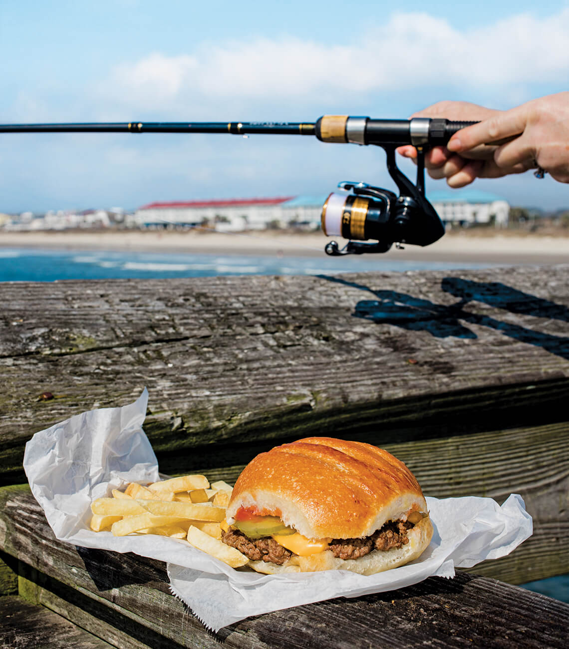 A cheeseburger from the grill at Ocean Isle Beach Pier fuels a day of fishing — or of swimming and building sandcastles on the beach. photograph by Matt Ray Photography
