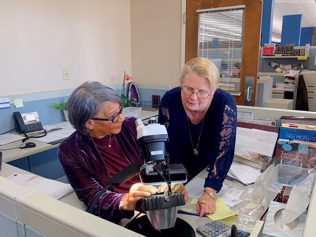When valuing estate jewelry, gemologists Anita Ford (left) and Carey de Tota pull out their jewelers’ loupe to inspect each piece under high magnification. photograph by Replacements, Ltd.