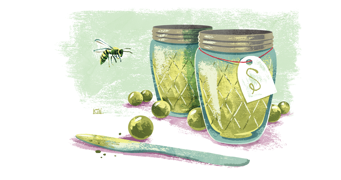 Not convenient, not white, and not dainty, but what a scuppernong’s mostly not is a grape — at least not a grape like the ones I grew up picking. Every summer, I had to compete with vicious, territorial yellow jackets, and pick grapes so my mother could make jelly. This was an all-day affair, when the kitchen was sauna-like from steaming water baths for the Ball jelly jars with their crystal-faceted sides. On stove eyes, more vats boiled and burbled with juice the color of Maleficent’s cape. The counters were covered with paper towels, on which my mother smacked the spoon that she’d used to skim off the foam. The foam sat there, violently purple and globby and disgusting, a cross between melted cotton candy and Jabba the Hutt.