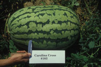 Todd Dawson grows a variety of watermelon called ‘Carolina Cross.’ This type of melon is known for its gigantic fruit, which has an oblong shape; light green rind; and narrow, dark green stripes. Dawson doesn’t order his seed from a catalog. He trades seeds with growers around the world to collect the best traits.
