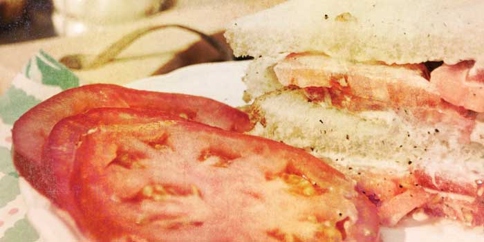 So, a homegrown crop with a long growing season, consumed constantly by people used to doing for themselves, and a sandwich that’s a quick and convenient way to eat it. With a native condiment that somehow makes it special. Maybe the tomato sandwich, Southern style, does have a claim to iconic status. In fact, maybe that tomato sandwich and I have a few things in common. Like me, the tomato showed up here in the South as an immigrant — and stayed. In fact, it’s gone all over the world, but somehow it seems to have found a special place for itself here, prospered, made a home.