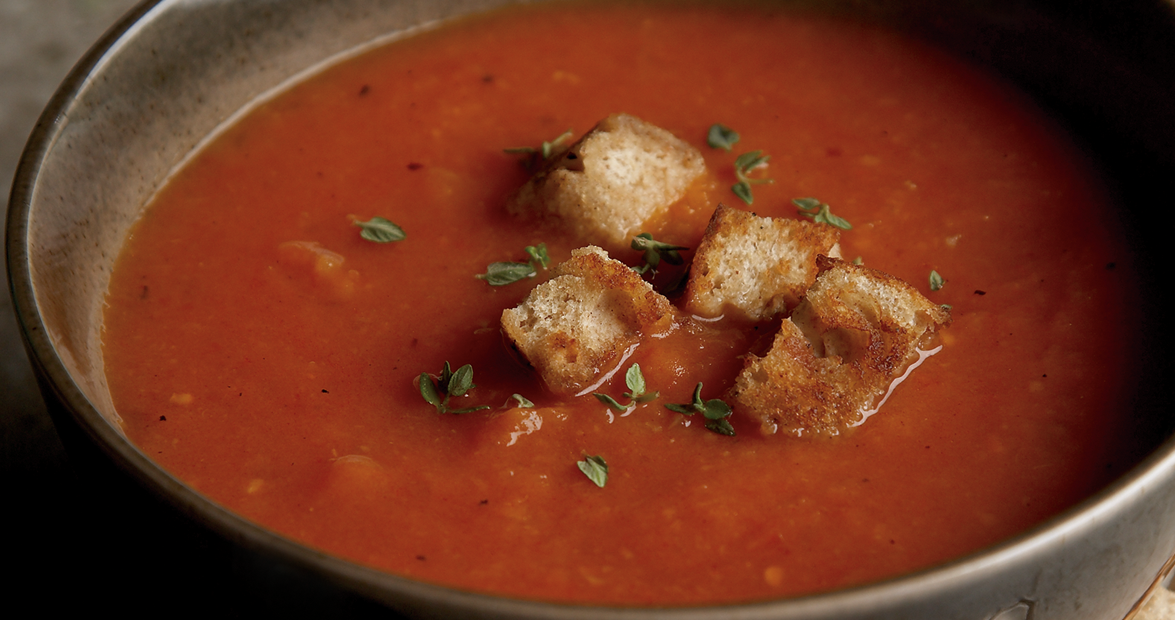 Sweet Potato-Tomato Soup with Bacon Croutons