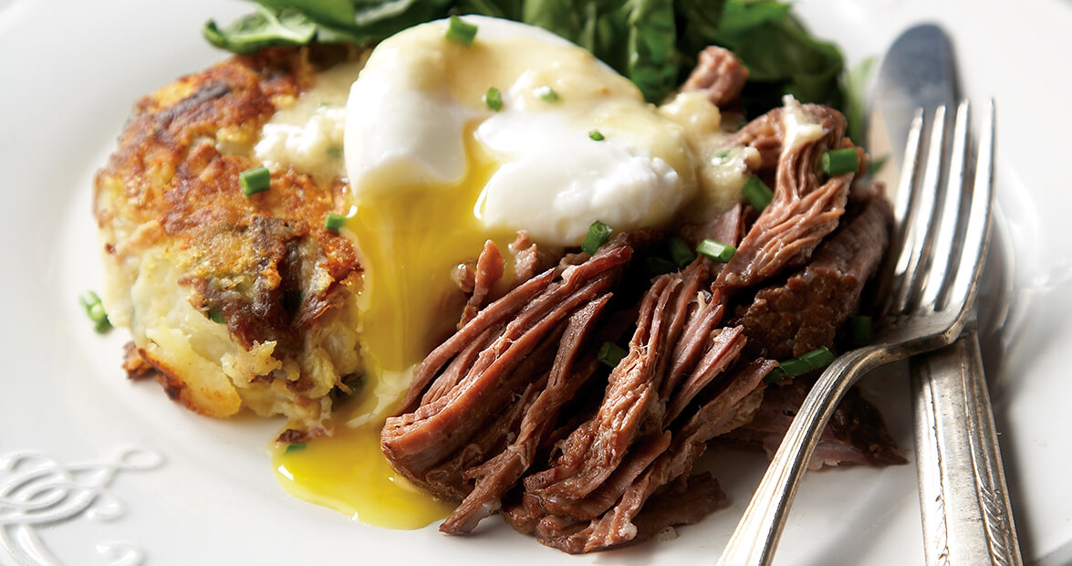 Pot Roast Potato Cakes with Poached Eggs, Fresh Greens, and Horseradish-Mustard Vinaigrette