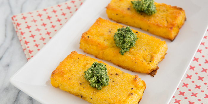 Garlicky Baby Collard Green Pesto with Parmesan and Cracked Black Pepper Grit Cakes