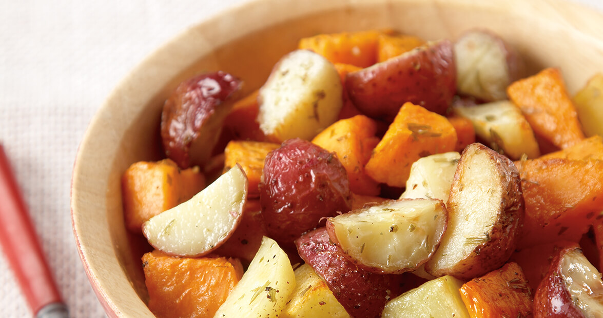 These roasted potatoes from St. Brendan the Navigator's cookbook combine sweet and yellow potatoes and make a perfect holiday side dish.