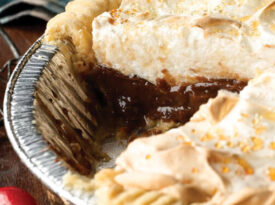 This chocolate custard pie is topped with a classic meringue, and would be the perfect addition to your potluck dessert table.