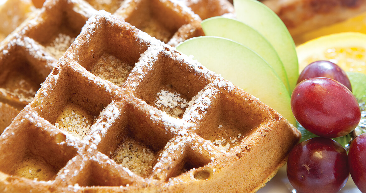 Enjoy brisk fall mornings with a plate of pumpkin Belgian waffles topped with fruit and a steaming cup of Joe.
