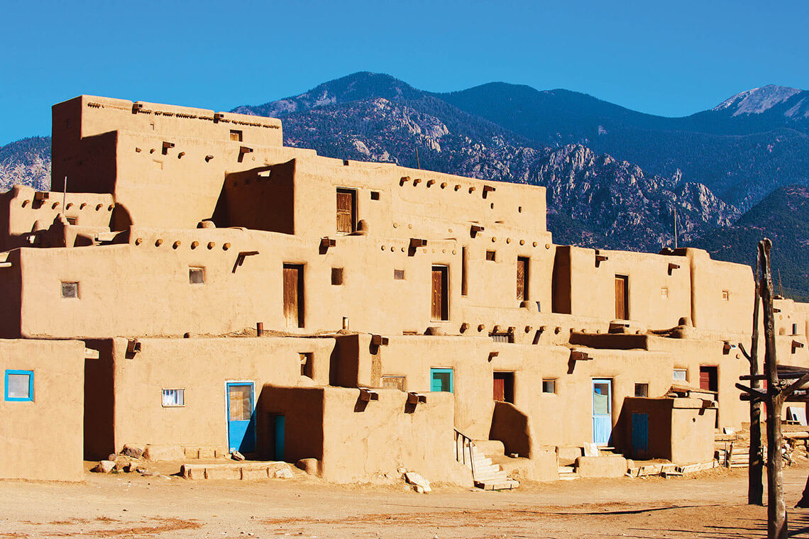 Travel north via the “High Road to Taos,” passing through ancient villages founded in the 1700s. Stop in the Spanish village of Chimayo to visit El Santuario, revered by pilgrims for the healing power of dirt, found inside the chapel. Arrive in Taos, the historic home of the Pueblo Indians. We will enjoy a brief tour of Taos and learn about this fascinating city rich in culture and scenery. Atop a plateau between the Rio Grande and the Sangre de Cristo Mountains, Taos has lured artists and writers since the 19th century. Enjoy lunch on your own and shopping in the many galleries and shops of the Taos Plaza. Later we will enjoy a tour of the Taos Pueblo, one of the oldest continuously inhabited communities in North America, before returning to Santa Fe for the evening.