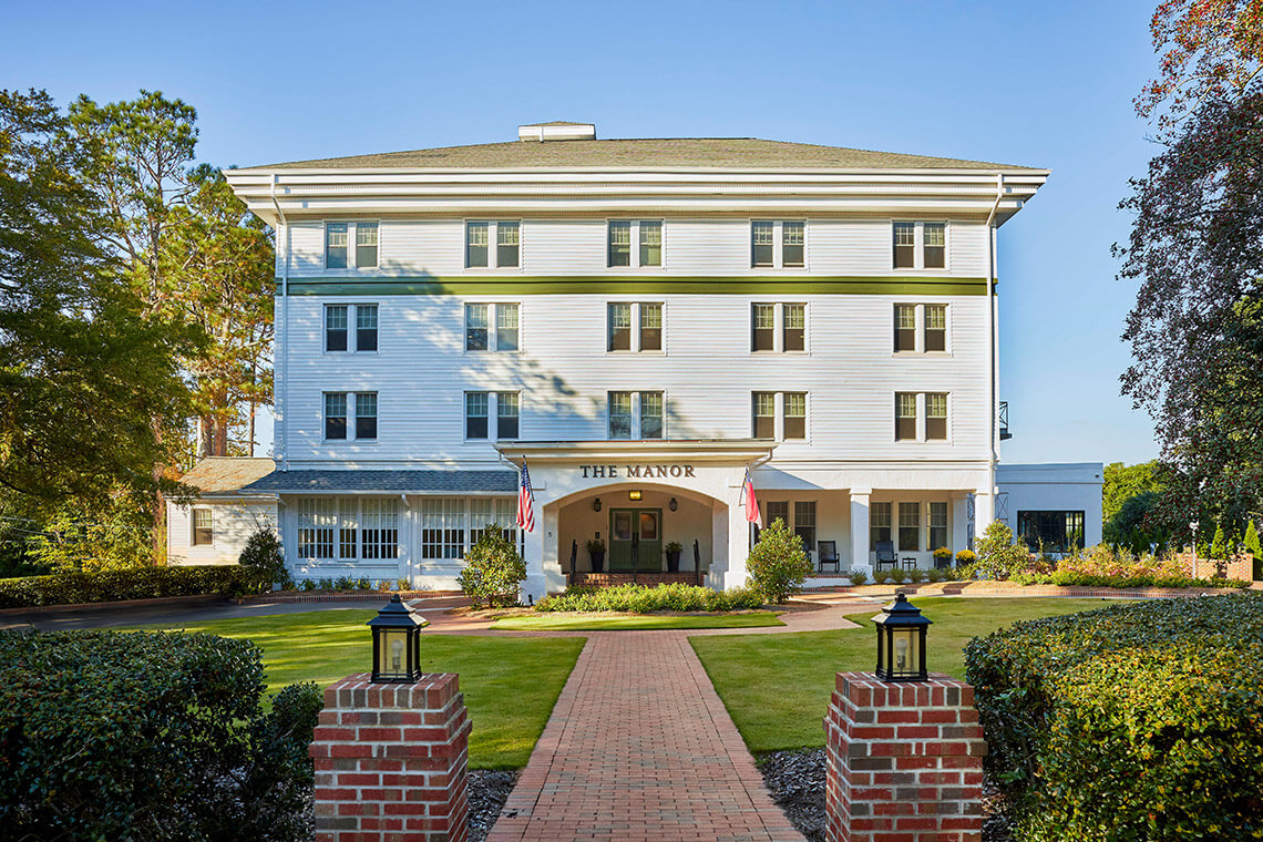 A year-long renovation completed in 2019 transformed The Manor, originally opened in 1923, into a contemporary hotel wrapped in classic charm. Beyond the communal lobby lie well-appointed rooms designed for comfort. The North & South Bar offers a wide selection of fine whiskeys and cocktails, while just outside, Pinehurst Brewing Co. pours craft beer brewed on site. The Village of Pinehurst is also just a short walk away, making The Manor as convenient as it is memorable.