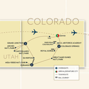 Visit Mesa Verde, Arches, Canyonlands, and Great Sand Dunes national parks as we explore the Rocky Mountains of Colorado and the red rocks of Utah. Three distinct train rides infuse our travels with a sense of Old West adventure, history, and the pure joy of riding the rails. From the Durango and Silverton Railroad to the Pikes Peak Cog Railway to the Royal Gorge Railroad, it’s all aboard for good times.