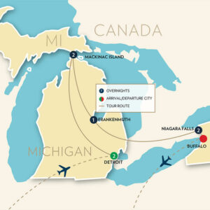 Explore the iconic sights and culture of northern Michigan and the mighty Niagara Falls during a beautiful time of year. We’ll learn about Henry Ford’s Detroit, go back in time on the car-free Mackinac Island, unwind on the front porch of one of the country’s most famous hotels, stroll the Bavarian-style streets of Frankenmuth, Michigan, and marvel at the power and beauty of North America’s largest waterfall.