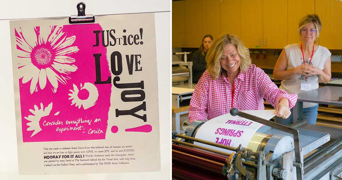 - Community Postcards and Prints – Create community postcards on a Vandercook letterpress, one of the few in the state, and then create high-contrast, screen-printed posters inspired by Sister Corita Kent’s collage-style work.