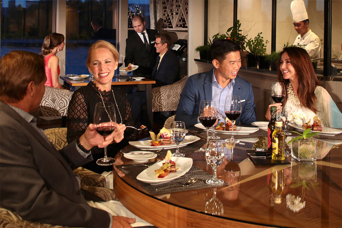 The inviting Main Restaurant accommodates both those wishing to socialize and those seeking a more intimate meal. Dedicated wine tables for groups feature a veritable rainbow of patterns reflecting the diverse cruisers and cultures you’ll be introduced to on your cruise.