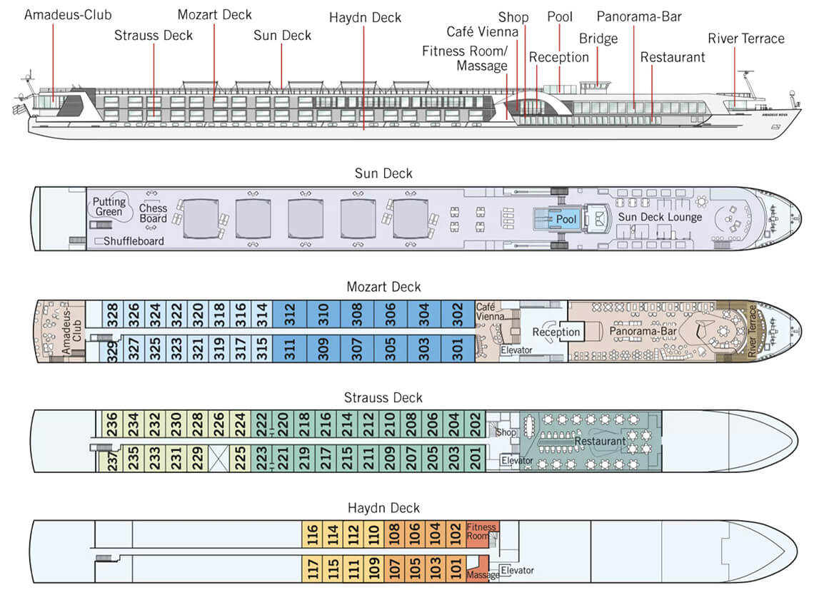 Once you board, unpack just once. All staterooms are larger than traditional river cruise cabins and offer excellent river views. The Mozart Deck features 12 suites with walk-out balconies. The other 16 staterooms on the Mozart Deck and 35 staterooms on the Strauss Deck feature innovative panoramic drop-down windows. The 16 staterooms on the Haydn Deck have a fixed window. All staterooms are fully equipped with comfortable and modern furnishings, including flat-screen TVs and large private bathrooms with a shower.