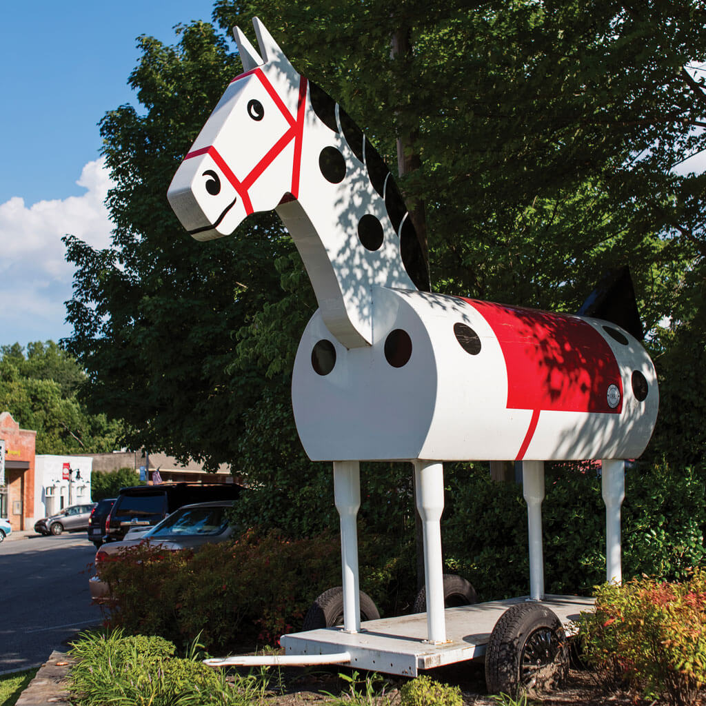 The signs are subtle at first: Fire hydrants painted as huntsmen. Businesses bearing “Boots and breeches welcome here” decals. Life-size painted horses striking poses at random locations. Jockey statues by driveways. And then you’ll see Morris the Horse, a giant red, black, and white replica of a child’s pull toy by the railroad tracks that slice through town, and you’ll understand: Tryon, this Foothills community of only 1,600 people, is synonymous with horses, and has been for a century.