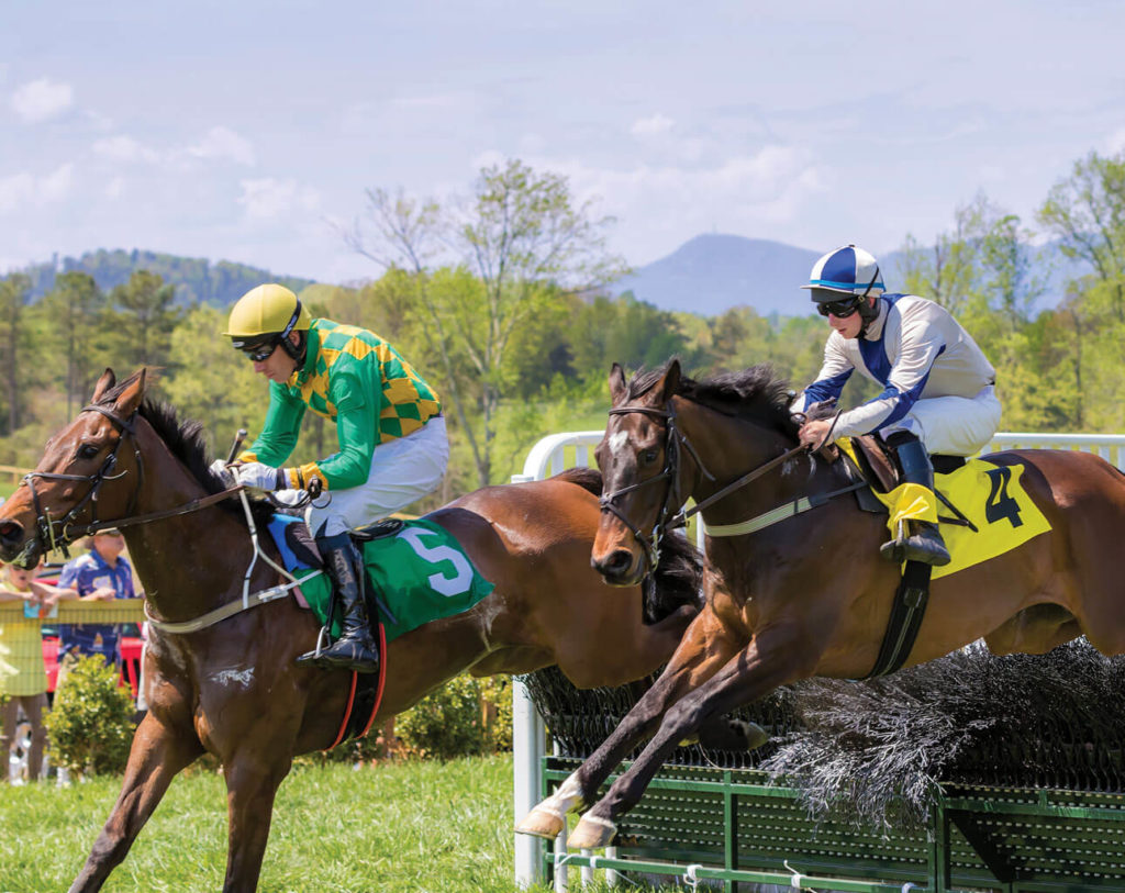 The historic Tryon Block House Steeplechase, founded by the Tryon Riding and Hunt Club, has been a springtime tradition since Carter Brown launched the race in 1947. Festive spectators arrive at the Green Creek Race Course ready to tailgate and cheer on favorites. Judges select winners for the best hat, best pants, and, of course, best tailgating spread. photograph by Don West Photography