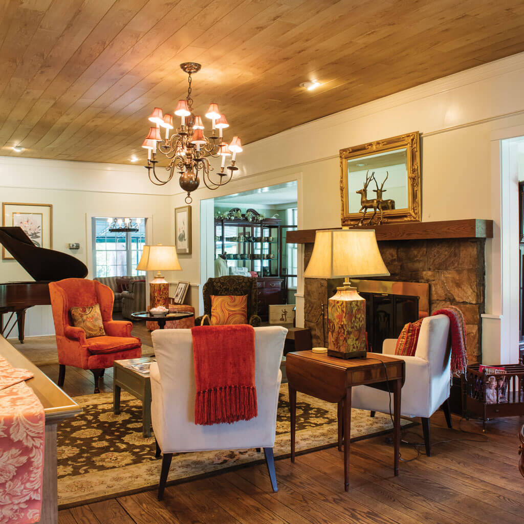 We stayed at the 1906 Pine Crest Inn, where, like Brown’s guests, as well as F. Scott Fitzgerald and Ernest Hemingway, my parents’ out-of-town friends stayed when they came for weekend house parties in Rutherfordton. Cabins surround the central house, with its gracious, wide-planked lobby. The porch was built with stones left over from the construction of Biltmore House. Shin-high to head-high stone walls are everywhere in Tryon. “My first two years here,” Johnson says wryly, “I backed my car into every single one of them.”